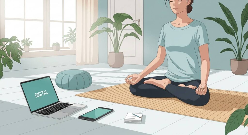 両者を組み合わせた実践方法は意外とシンプルです。まず、朝起きてすぐにスマートフォンをチェックする代わりに、10分間の簡単なヨガのポーズと呼吸法から一日をスタートします。サンサルテーション(太陽礼拝)のような流れるような動きは、体を目覚めさせるのに最適です。この時間はあえて機器の電源を切るか、別室に置いておくことがポイントです。